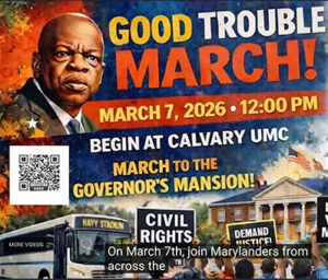 “The Caucus of African American Leaders (CAAL) and others will host the Saturday, March 7, 2026, 12 noon “Good Trouble March and Rally”. We will gather at the Calvary United Methodist Church, 301 Rowe Boulvard, Annapolis, Maryland, by no later than 11:30 a.m. and march to Lawyer’s Mall.